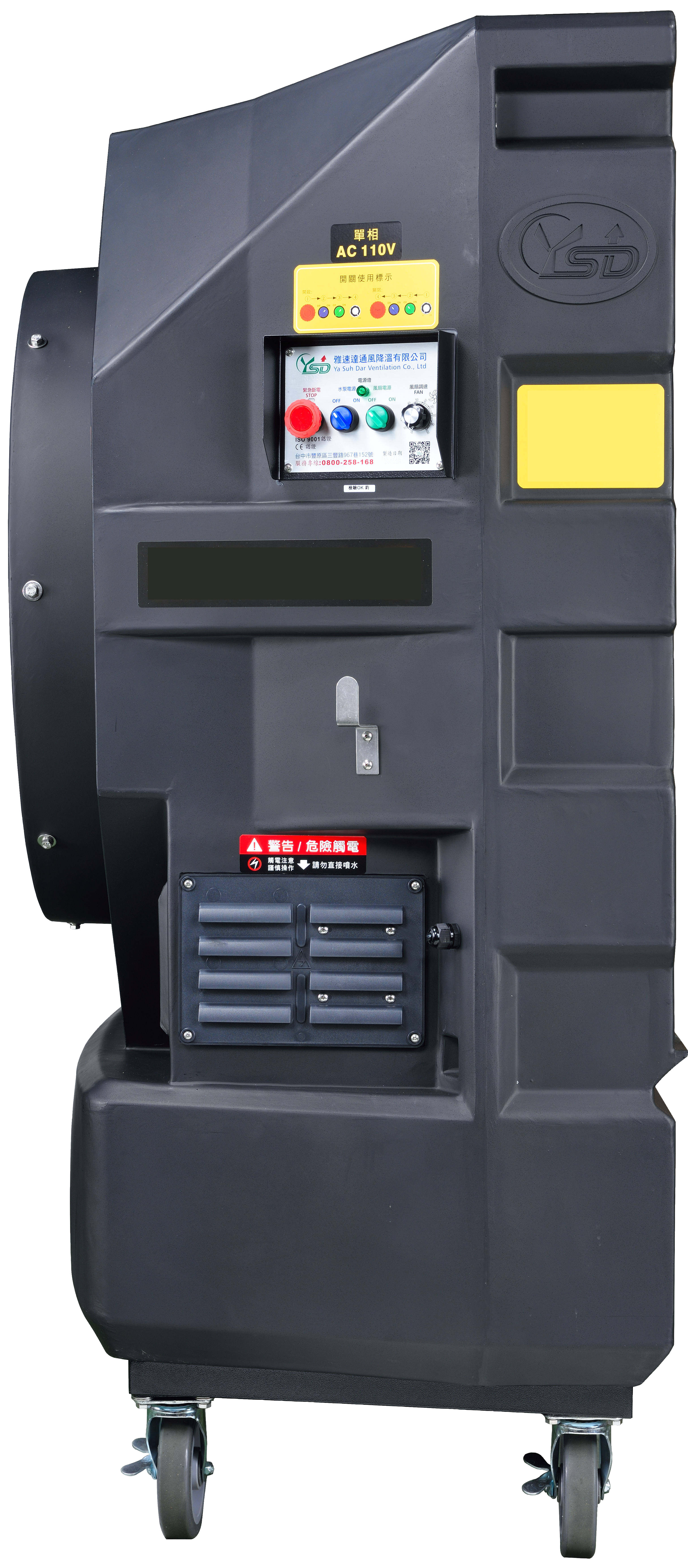Ya Suh Dar M702-COOL – Refroidisseur évaporatif puissant et économe en énergie Le Ya Suh Dar M702-COOL est un refroidisseur d’air adiabatique mobile à haute efficacité énergétique, conçu pour un usage professionnel. Cet appareil Plug & Play assure des températures agréables dans les usines, zones industrielles, ateliers de production, restaurants ou hôtels. Il est idéal pour des surfaces allant jusqu’à 220 m², avec un débit d’air de 22 000 m³ par heure. Le M702-COOL convient aussi bien pour une utilisation à l’intérieur qu’à l’extérieur. Utilisation simple grâce à un écran de commande clair : Power : marche/arrêt et bouton d’arrêt d’urgence Power of Pump : activation ou désactivation de la pompe Power of Fan : activation ou désactivation du ventilateur (le flux d’air puissant atteint plus de 15 mètres) Fan Speed Regulator : réglage progressif de la vitesse du ventilateur Refroidissement naturel et écologique Le refroidisseur adiabatique (ou évaporatif) rafraîchit naturellement l’air ambiant grâce à l’eau. L’air aspiré traverse un panneau humidifié par l’eau du réservoir, puis est refroidi par évaporation. Ce processus ne se contente pas de refroidir l’air, il filtre également la poussière et les impuretés grâce au circuit d’eau. Ce système est économe en énergie et respectueux de l’environnement. Grâce au tuyau fourni, l’appareil peut être raccordé directement à l’arrivée d’eau, permettant ainsi un remplissage automatique du réservoir. Astuce du fabricant : ajouter des blocs de glace dans le réservoir permet d’amplifier l’effet de refroidissement. Le réservoir d’eau a une capacité de 145 litres, et le refroidisseur Ya Suh Dar est facile à nettoyer et à entretenir. Mobilité et praticité Grâce à ses roulettes verrouillables, le refroidisseur adiabatique se déplace aisément et peut être installé rapidement à l’endroit souhaité. Le tuyau d’eau et le câble d’alimentation peuvent être rangés sur les supports latéraux prévus à cet effet, pour un rangement sûr et pratique. Caractéristiques principales : Pour des surfaces jusqu’à 220 m² Débit d’air : 22 000 m³/h Portée du flux d’air : 15 mètres Système Plug & Play Écran de commande clair et intuitif Interrupteur marche/arrêt de la pompe Interrupteur marche/arrêt du ventilateur Vitesse du ventilateur réglable en continu Panneau de refroidissement par eau Protection contre le fonctionnement à sec Châssis robuste et de haute qualité en polyéthylène Supports latéraux pour le tuyau d’eau et le câble d’alimentation Mobilité facilitée : roulettes avec freins Fabriqué à Taïwan, certifié ICO, CE et autres normes internationales