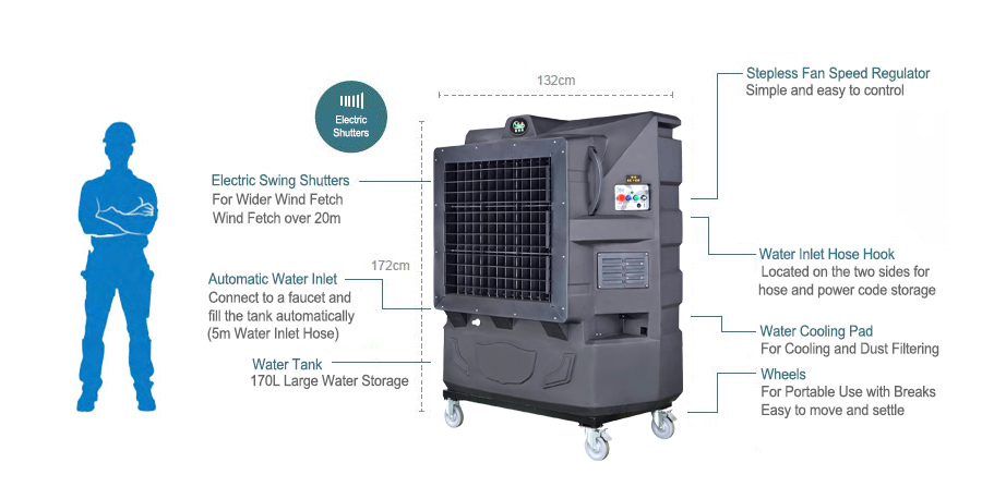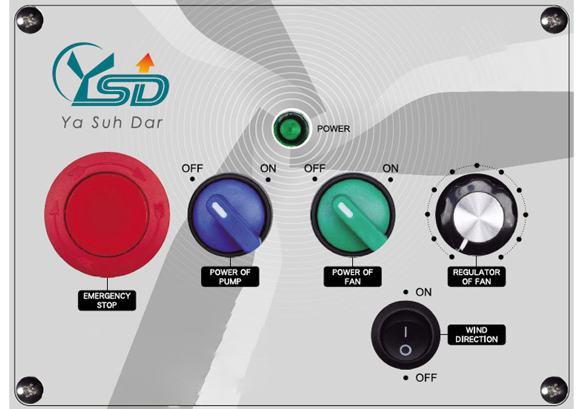 Ya Suh Dar M703 COOL UV C Refroidisseur adiabatique avec lampe UV C Le Ya Suh Dar M703 COOL UV C est un refroidisseur adiabatique mobile et écoénergétique conçu pour un usage professionnel. Ce modèle est équipé d’une lampe UV C intégrée. L’eau est exposée à la lumière UV C, ce qui élimine les micro organismes tels que bactéries, champignons et virus. Selon le fabricant, cette fonction détruit instantanément 99 pour cent des bactéries et élimine également les éventuelles odeurs présentes dans l’eau. Le ventilateur diffuse ensuite un flux d’air propre et filtré. L’appareil est certifié SGS. Cet appareil Plug and Play assure des températures agréables dans les usines, les environnements industriels ou de production, les restaurants et les hôtels. Il convient pour des surfaces jusqu’à 250 m² avec une circulation d’air de 25 000 m³ par heure. Il peut être utilisé pour le rafraîchissement de zones intérieures et extérieures. L’écran clair rend l’utilisation très simple Power: marche, arrêt et arrêt d’urgence Power of Pump: marche et arrêt de la pompe Power of Fan: marche et arrêt du ventilateur. Le puissant flux d’air atteint plus de 15 mètres Fan Speed Regulator: réglage progressif de la vitesse du ventilateur UV C Light: fonctionne avec la pompe, détruit immédiatement 99 pour cent des bactéries et élimine les odeurs de l’eau Un refroidisseur adiabatique fonctionne grâce à l’évaporation de l’eau. L’air est aspiré à travers un panneau humidifié par le réservoir puis rafraîchi par évaporation. En plus de rafraîchir l’air ambiant, ce processus filtre également la poussière et les impuretés grâce au circuit d’eau. Il s’agit d’une solution très économique et respectueuse de l’environnement. Grâce au tuyau fourni, l’appareil peut être directement raccordé à l’arrivée d’eau pour permettre le remplissage automatique du réservoir. Astuce du fabricant: ajouter des glaçons ou un pad de refroidissement dans le réservoir peut renforcer l’effet de refroidissement. Le réservoir offre une capacité de 170 litres. Le refroidisseur Ya Suh Dar est simple à nettoyer et à entretenir. Les roulettes verrouillables permettent de déplacer facilement le refroidisseur adiabatique et de l’installer où vous le souhaitez. Le tuyau d’arrivée d’eau et le câble d’alimentation peuvent être fixés sur les supports situés sur les côtés de l’appareil pour un rangement sûr. Caractéristiques Surfaces jusqu’à 250 m² Circulation d’air de 25 000 m³ par heure Portée du flux d’air: 15 mètres Avec lampe UV C: élimine 99 pour cent des bactéries et supprime les odeurs de l’eau Plug and Play Écran clair et simple Bouton marche arrêt pour la pompe Bouton marche arrêt pour le ventilateur Vitesse du ventilateur réglable Water cooling pad Protection contre le fonctionnement à sec Châssis robuste en polyéthylène de haute qualité Supports pour le tuyau d’arrivée d’eau et le câble d’alimentation Mobile et facile à déplacer: roulettes avec freins Fabriqué à Taïwan, certifié ICO, CE et autres normes